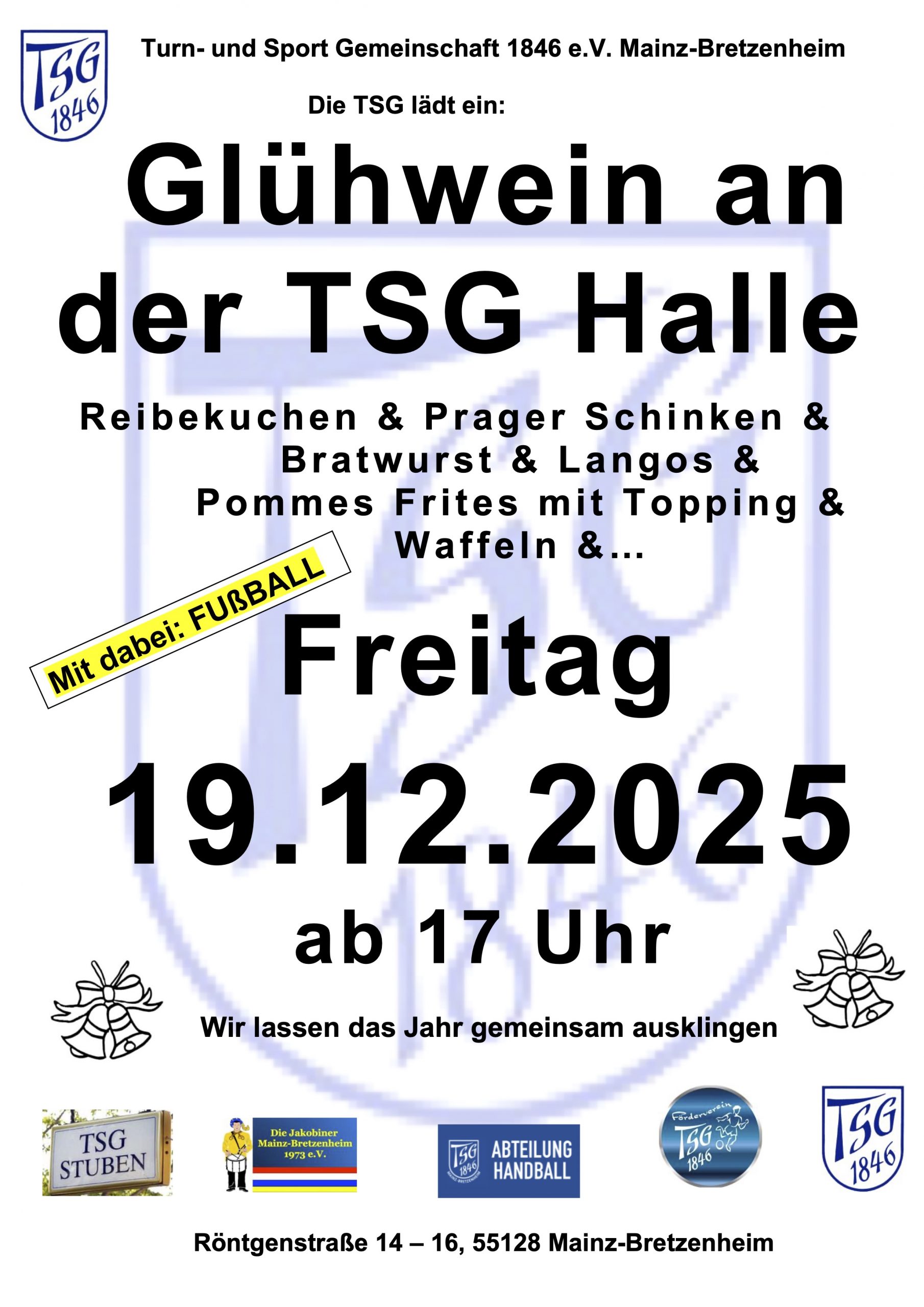 Seid dabei, wenn es am 19. Dezember ab 17 Uhr wieder heißt: Glühwein an der TSG-Halle! Zusätzlich gibt es warme Wintersnacks in süß und deftig.